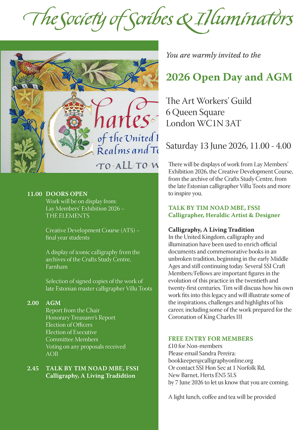 To reserve your place email: bookkeeper@calligraphyonline.org